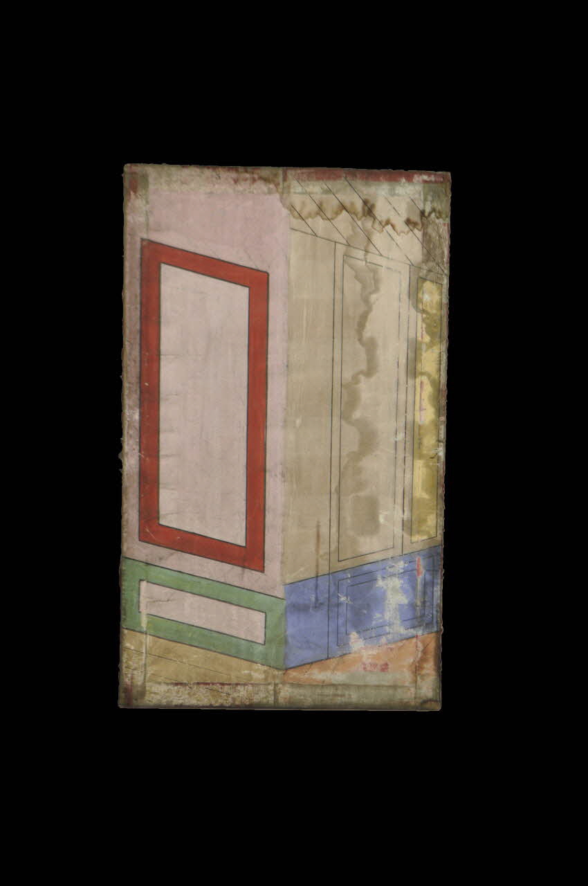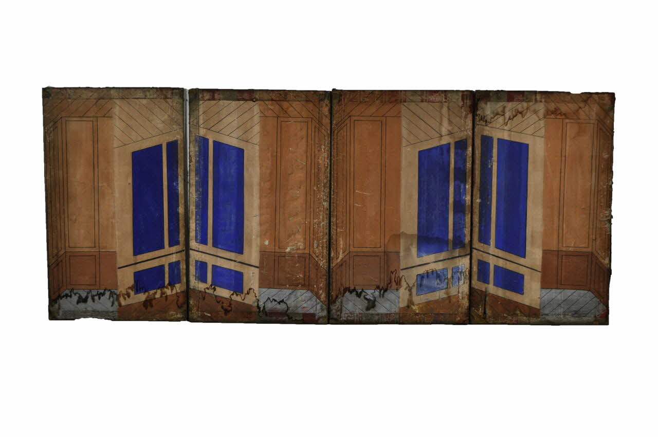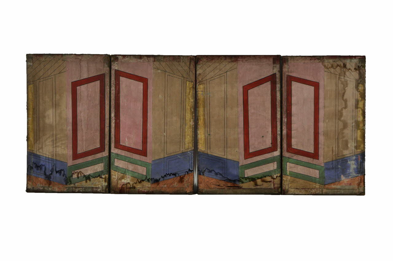 Le décor peint se retrouve sur les deux faces. La première montre un intérieur d'appartement avec des lambris de couleurs rouge, vert et bleu. La seconde présente également un décor d'intérieur d'appartement avec un élément peint en bleu foncé.Matériaux et techniques