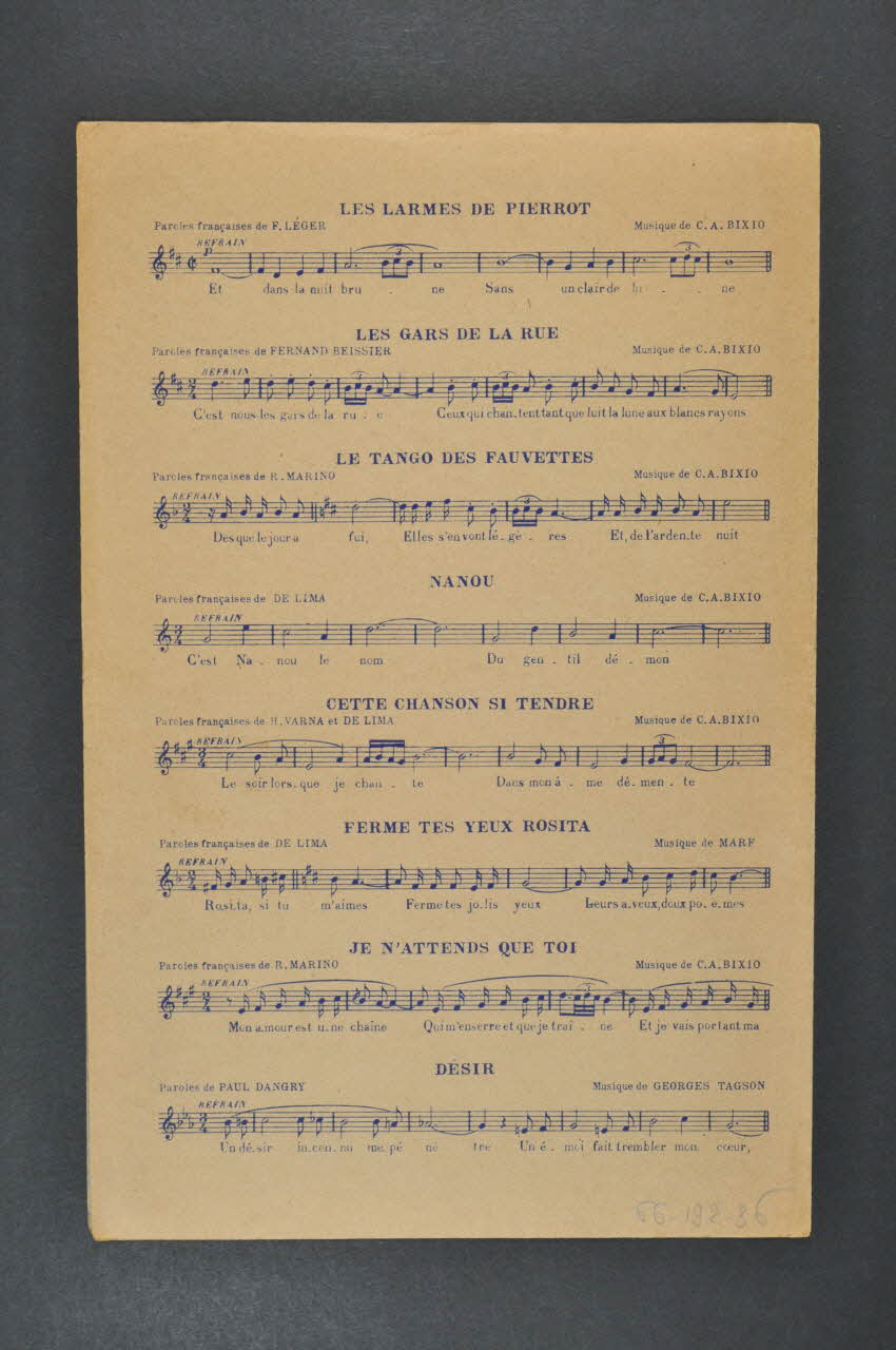 Des inscriptions renseignent le titre, les auteurs, les exécutants et l'éditeur. A l'intérieur, partition et paroles de la chanson. Au dos, liste d'autres partitions publiées par l'éditeur.Décor