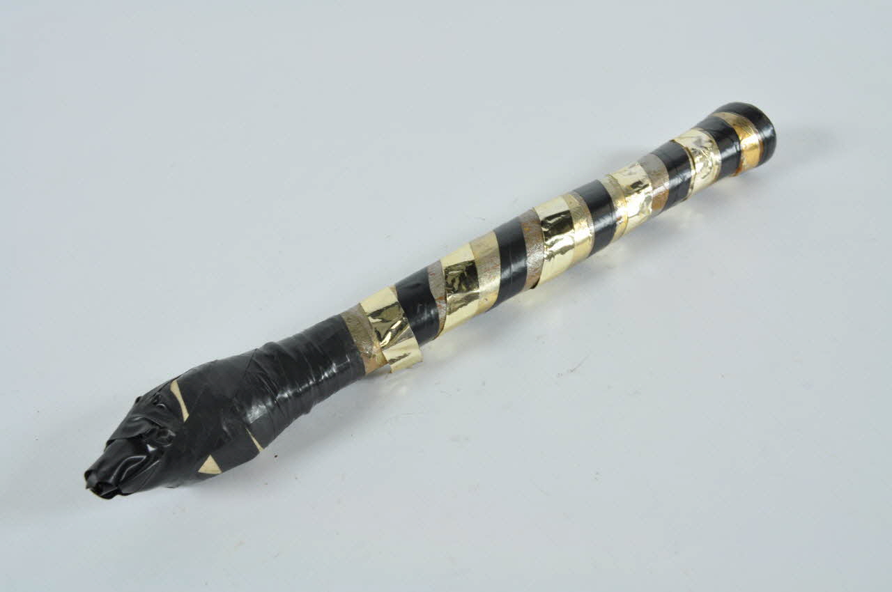 En bois, de section ovale, recouverte de peinture argenté. Un large ruban de papier métallisé doré, et un ruban adhésif noirs sont entourés autour du bois.Matériaux et techniques
