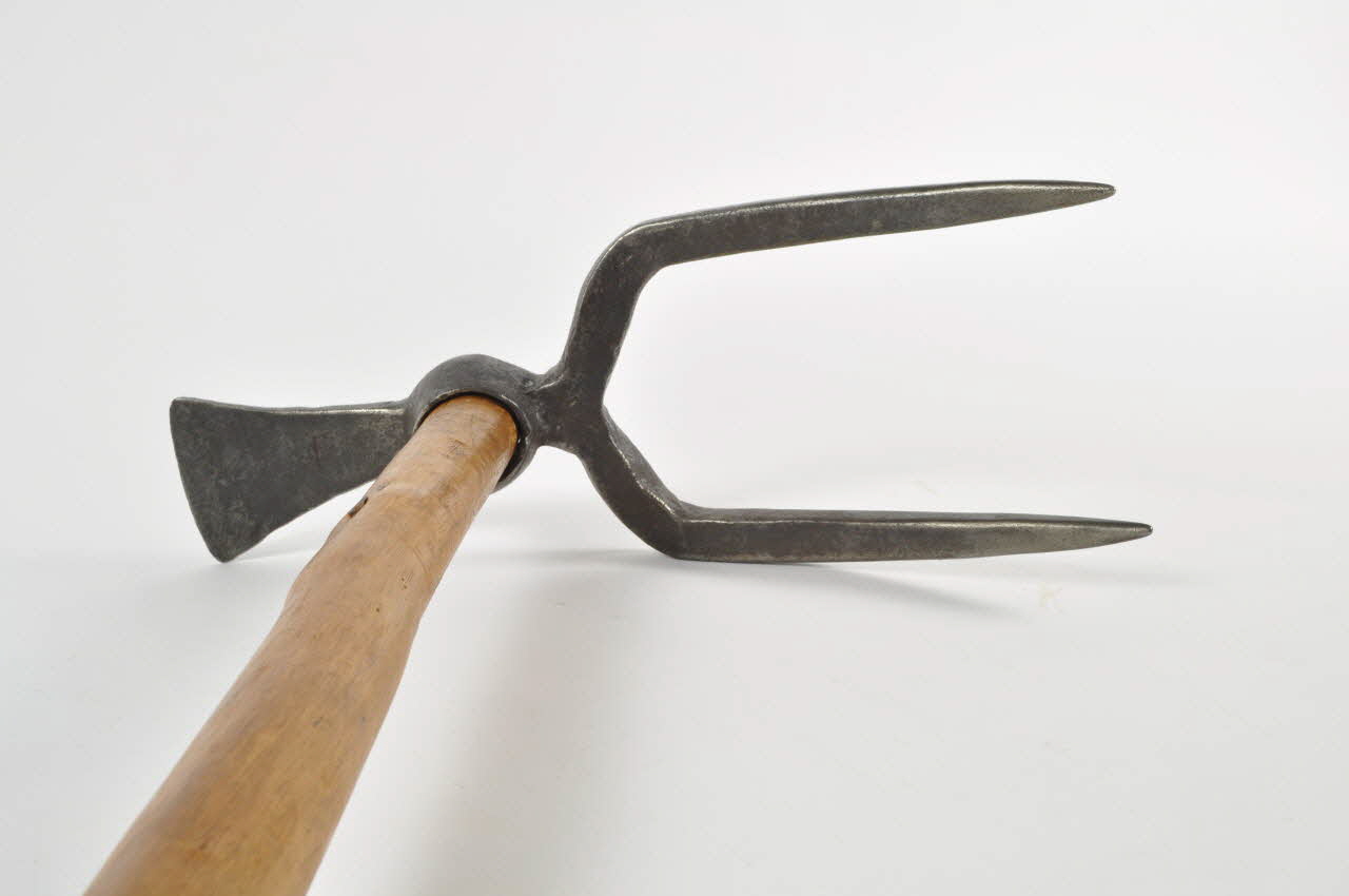 fer forgé et bois / Muni de deux dents pointues de section rectangulaire, prolongées par une lame triangulaire. Au centre est ménagé un emmanchement à oeil, dans lequel est fiché un long manche en bois.Matériaux et techniques