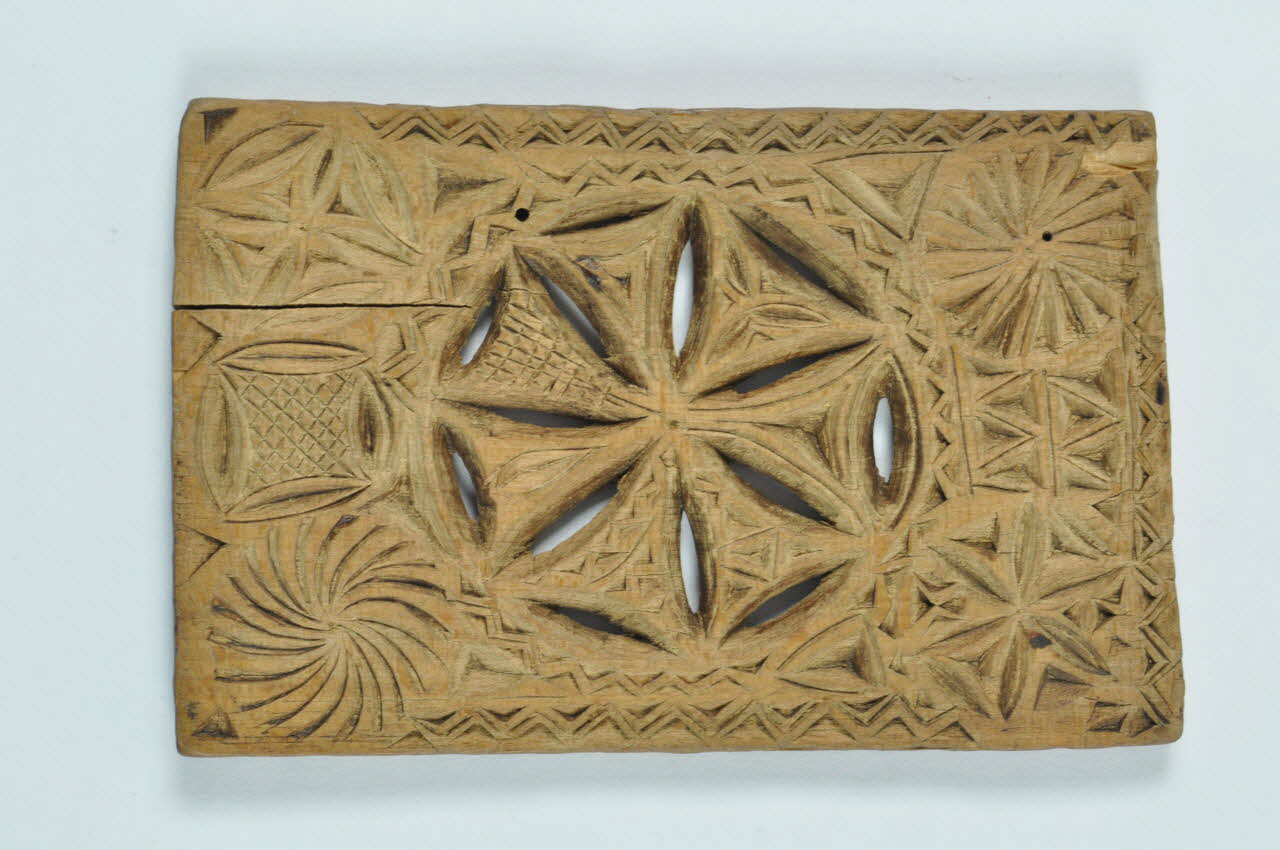 De forme rectangulaire et orné de motifs géométriques. D'un côté une rosace à sept feuilles ajourée aux intervalles différemment décorés, aux 4 coins par des rosaces : à rayons droits à quatre feuilles, à rayons droits à six feuilles, à rayons courbes et en dents de scie. De l'autre côté est présent le même ajour entoyré de quatre fleurs de lys aux coins, et décoré de coeurs et de motifs en dents de scie. Sur deux des tranches sont présents des motifs en dents de scie.Décor