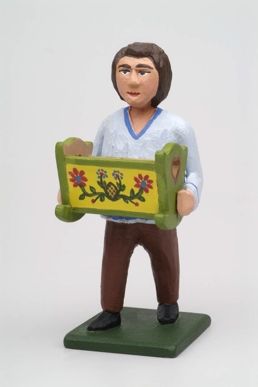 En bois de tilleul taillé et peint, représentant un homme apportant un berceau. Il est vêtu d'un pantalon marron et d'une chemise bleue. Il porte un berceau vert et jaune à motifs floraux, dans les bras.Décor