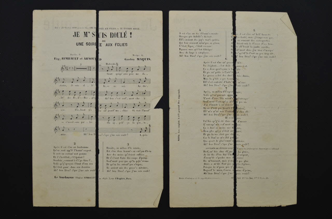 Feuillet rectangulaire en papier industriel, imprimé à l?encre noire. Partition en mauvais état de conservation, conservée en quatre morceaux suite à la déchirure de la tranche et de la pliure verticale médiane.