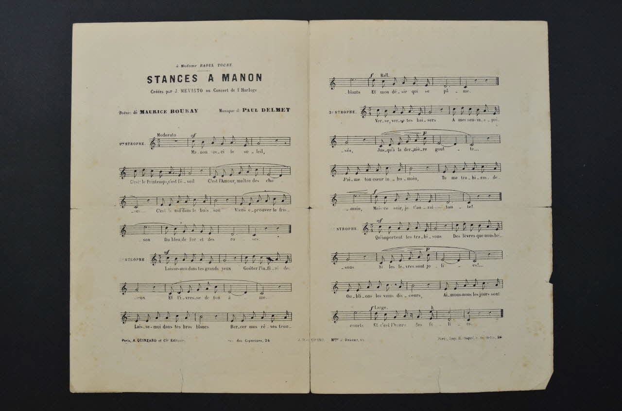 Les inscriptions renseignent le titre de la chanson, le nom des auteurs, de l'artiste et de l'éditeur. A l'intérieur, partitions et paroles de la chanson. Au dos, liste d?autres partitions publiées par l?éditeur.Décor