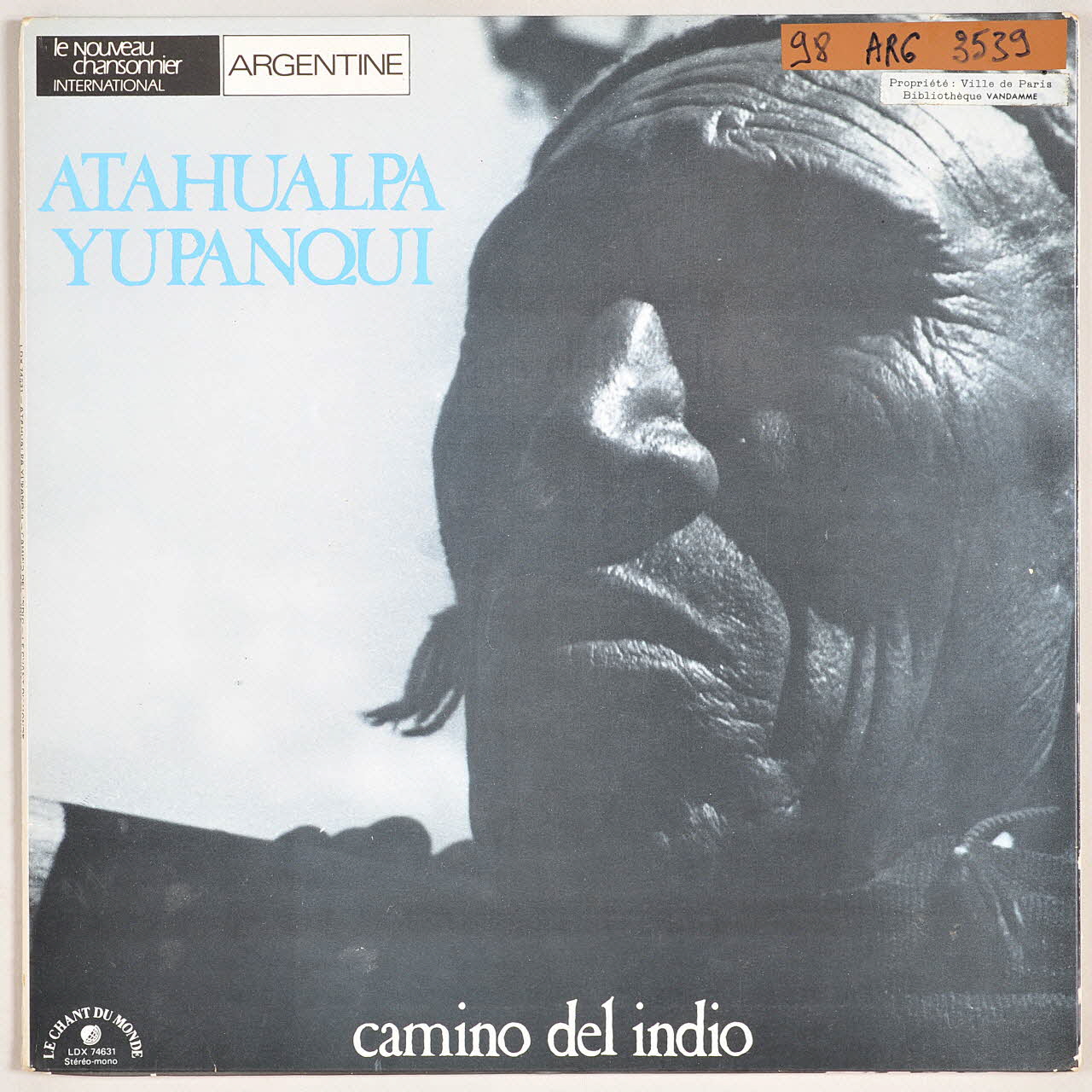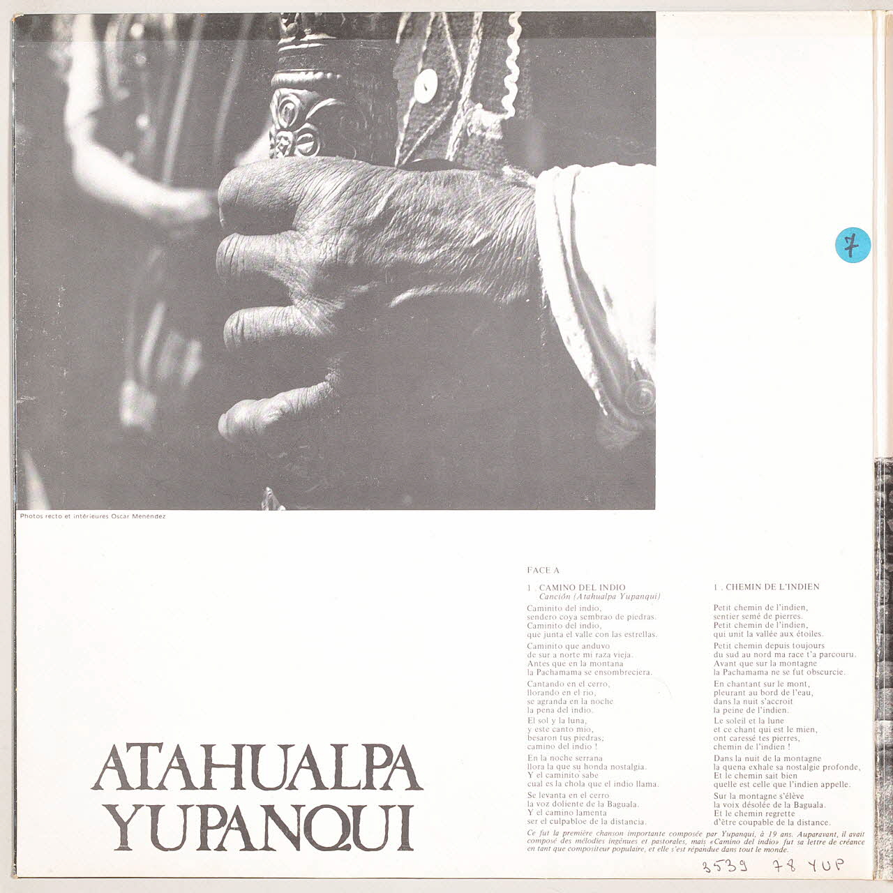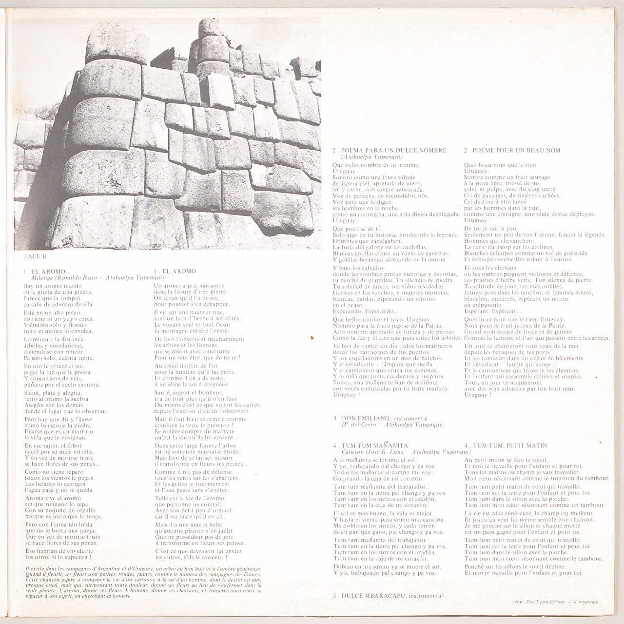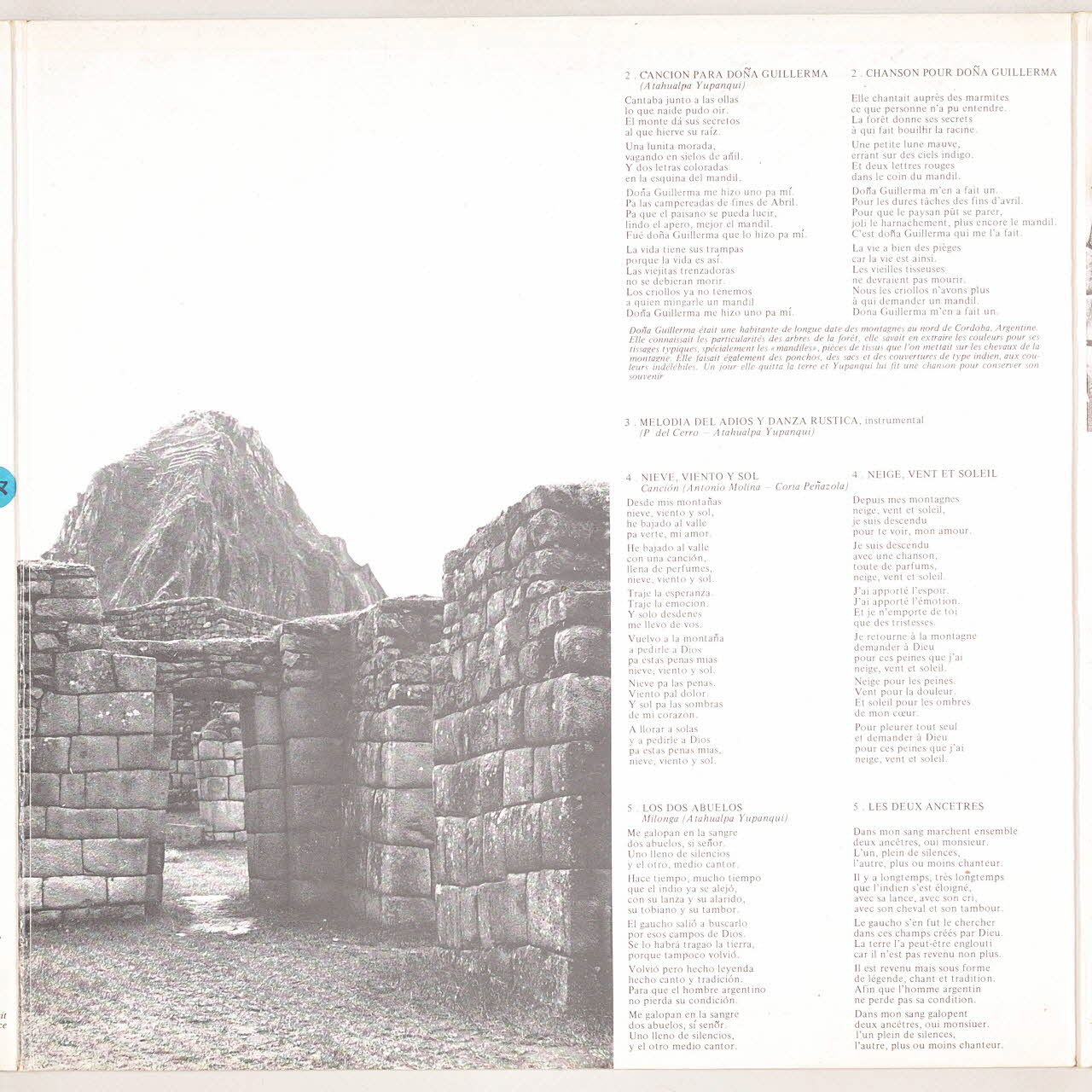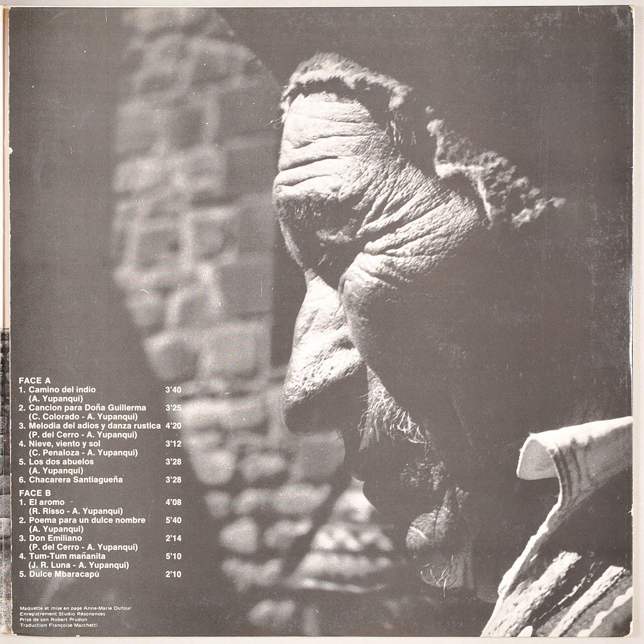 Le verso présente une photographie noir et blanc d'un buste d'un homme en costume jouant de la guitare. La pochette s'ouvre dans le sens horizontal en trois volets. A l'intérieur sont présents sur un fond blanc les textes des chansons en espagnol et en français. Sur le volet de gauche, une vue en plan rapproché d'une main tenant un objet sculpté. Sur les deux autres volets, il s'agit de vues de sites archéologiques précolombiens. Le verso du volet de gauche présente une photographie noir et blanc d'un gros plan sur le visage de profil d'un indien, devant un muret. L'étiquette au centre du disque présente un fond orange, sur lequel sont inscrits les titres et le logo de l'editeur.Inscriptions