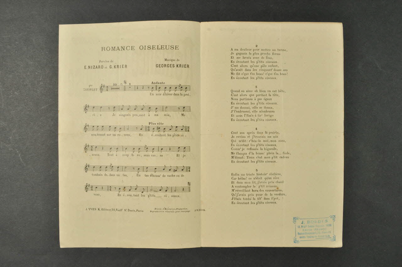 Les inscriptions renseignent le nom des auteurs, de l'artiste et de l'éditeur. A l'intérieur, partitions et paroles de la chanson. Au dos, liste d?autres partitions publiées par l?éditeur.Inscriptions