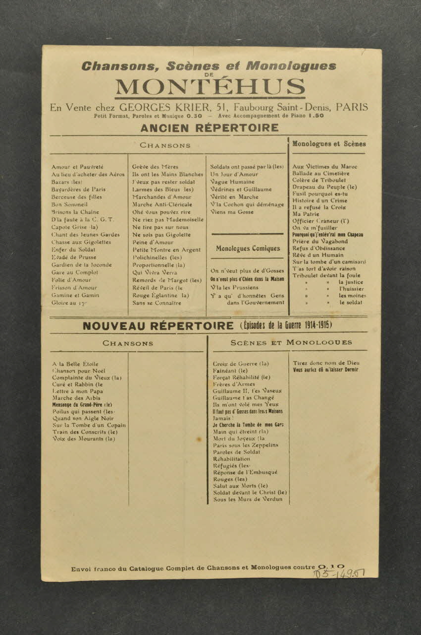 Feuillet rectangulaire en papier industriel, imprimé à l?encre noire. La couverture du feuillet présente le titre de la chanson.