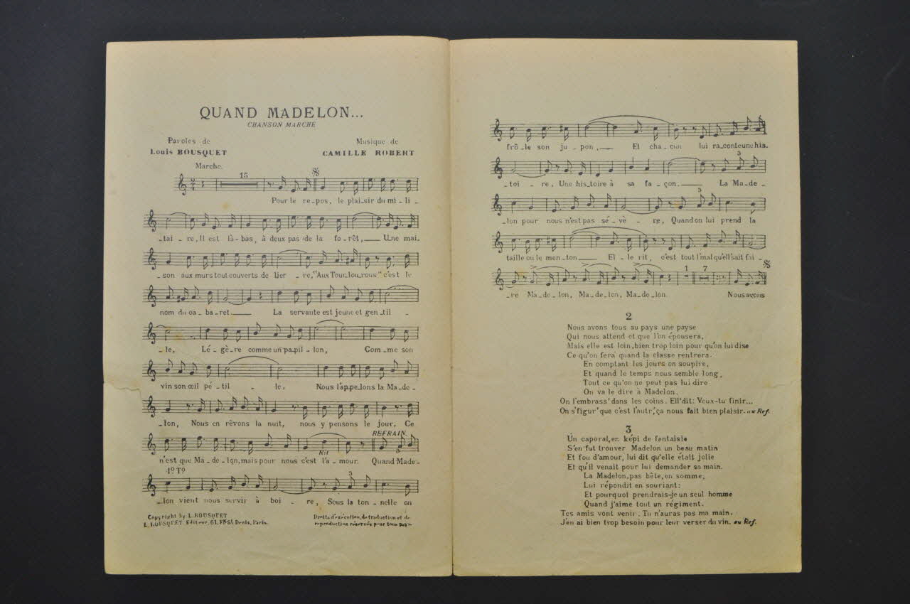 Sur la couverture, caricature des chanteurs Polin et Bach, en tenue militaire, en tête d'un régiment de soldats défilant dans la rue, devant un bistrot. Les inscriptions renseignent le titre de la chanson, le nom des auteurs, des artistes et de l'éditeur.