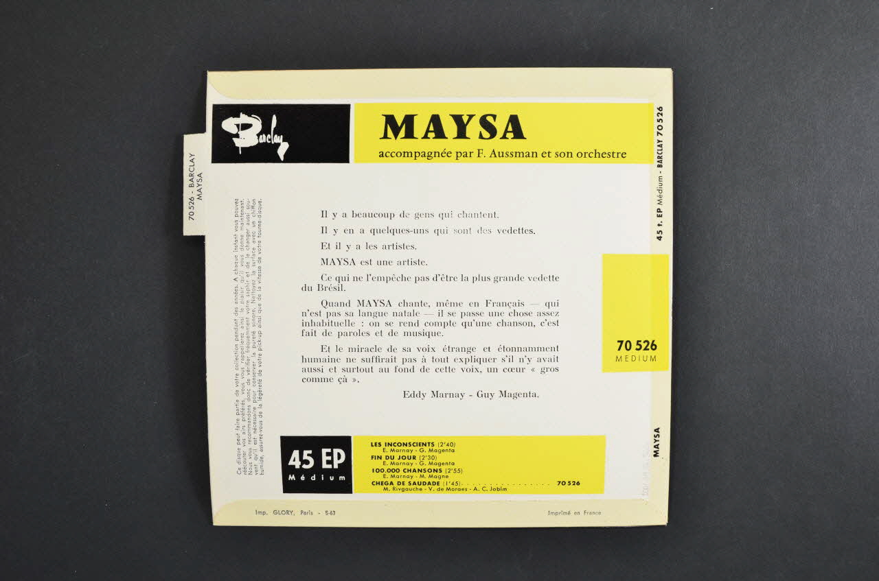 Le recto comporte une photographie noir et blanc de la chanteuse entrain de fumer. Le nom de l'artiste en jaune et les titres des chansons en blanc sont inscrits dans la partie supérieure. Le logo de l'éditeur est dans l'angle supérieur droit. Le verso contient le nom de l'artiste, les titres des chansons dans des rectangles jaunes et le logo de l'éditeur sur fond blanc. Un onglet blanc avec des inscriptions noires est situé le long de la bordure gauche.Matériaux et techniques