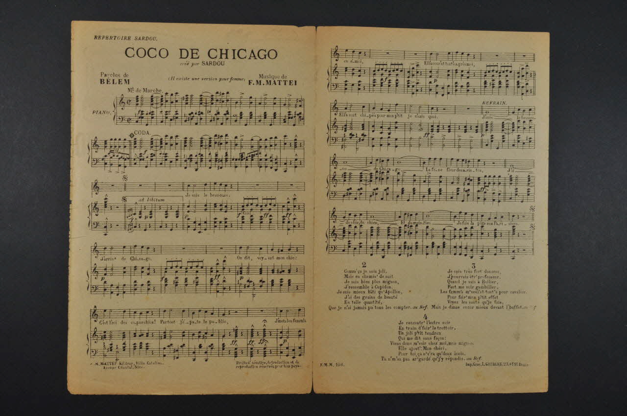Des inscriptions renseignent le titre, les auteurs, les exécutants et l'éditeur. A l'intérieur, partition et paroles de la chanson. Au dos, liste des succès de Mattei, avec un dessin art déco d'arabesque.Décor