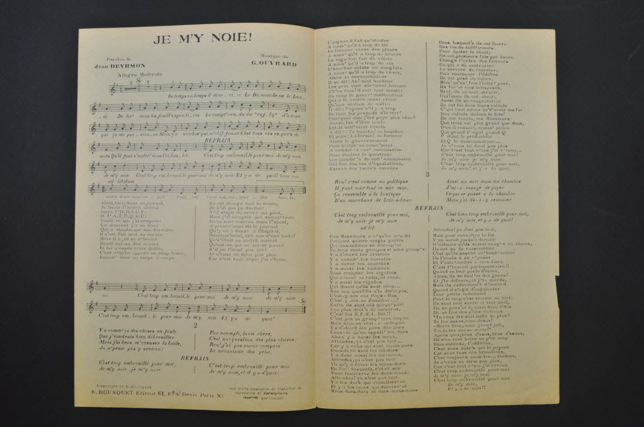 Feuillet rectangulaire en papier industriel imprimé à l'encre noire. L'intérieur présente les paroles et la partition de la chanson. Au dos, publicité pour l'éditeur.Matériaux et techniques