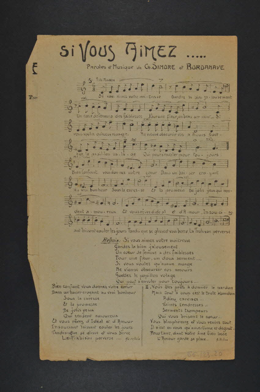 Les inscriptions renseignent le titre de la chanson, le nom des auteurs, de l'artiste et de l'éditeur. A l'intérieur et au dos, partitions et paroles de la chanson.Décor