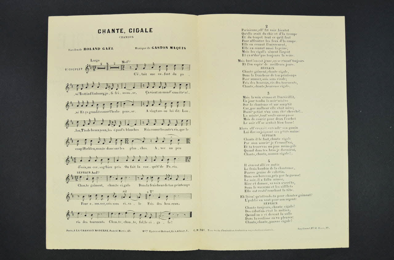 Des inscriptions renseignent le titre, les auteurs, les exécutants et l'éditeur. A l'intérieur, partition et paroles de la chanson. Au dos, liste d'autres partitions publiées par l'éditeur.Matériaux et techniques