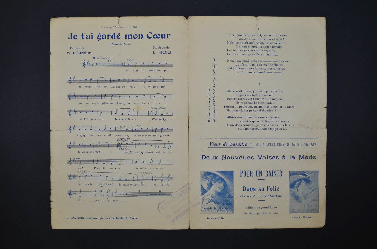 Feuillet rectangulaire en papier industriel imprimé. Le feuillet contient la partition et les paroles de la chanson. Au dos, publicité pour l'éditeur.Décor