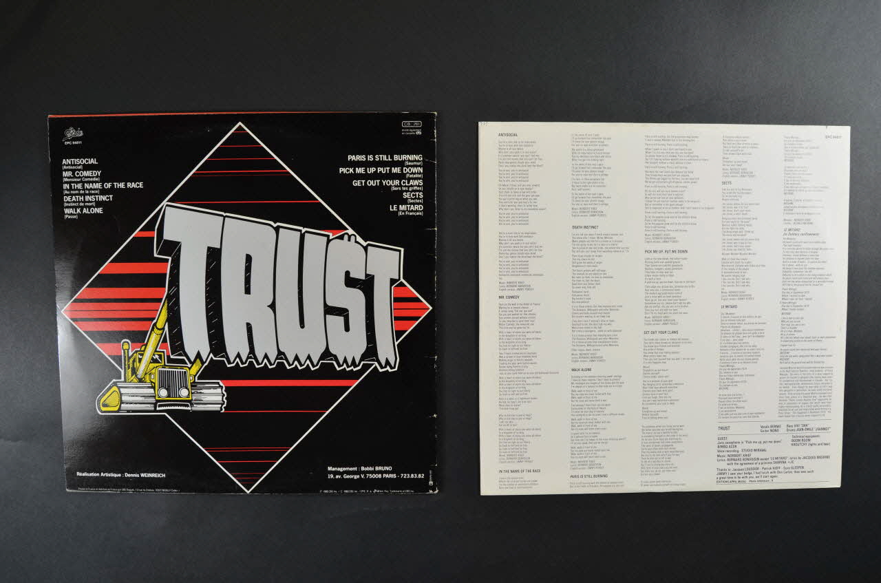 .2 : Pochette en papier cartonné, de forme carrée, pliée et collée. Elle présente le dessin d'une pelleteuse dont la pelle est formée par les lettres TRUST sur un fond rouge.