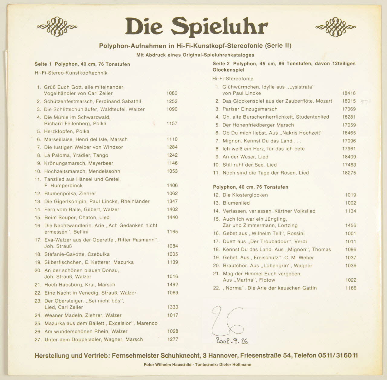 disque 33 tours, Oh, alte Birschenherrlichkeit, Der Hohenfriedberger marsch, An der schönen blauen Donau, Herzklopfen, Mazurka aus dem Ballett, Die Spieluhr, Die Nachtwandlerin, Eva-walzer aus der Operette, Das Glockenspiel aus der Zauberflöte, Beim Souper, Gebet aus, Weaner Madeln, Am wunderschönen Rhein, Unter'm Doppeladler, Die Klosterglocken, Die Gigerlkönigin, Silberfischchen, Mag der Himmel euch vergeben, Der Obersteiger, La Paloma, Pariser Einzugsmarsch, Mignon, Krönungsmarsch, Brautchor, Hoch Habsburg, Verlassen, verlassen, Kennst du das Land, Eine nacht in Venedig, Blumenpolka, Glühwürmchen, Die Mülhe im Schwarzwald, Norma, Noch sind die Tage der Rosen, Grüb euch Gott, Ich weib ein Herz, Die lustigen Weiber, Tanzlied aus Hänsel und Gretel, Blumenlied, Fern vom Balle, Gebet aus, La Marseillaise, Still ruht der see, Schützenfestmarsch, Ob du mich liebst, An der Weser, Duett aus, Stefanie, Auch ich war ein Jüngling, Die Schlittschuhläufer