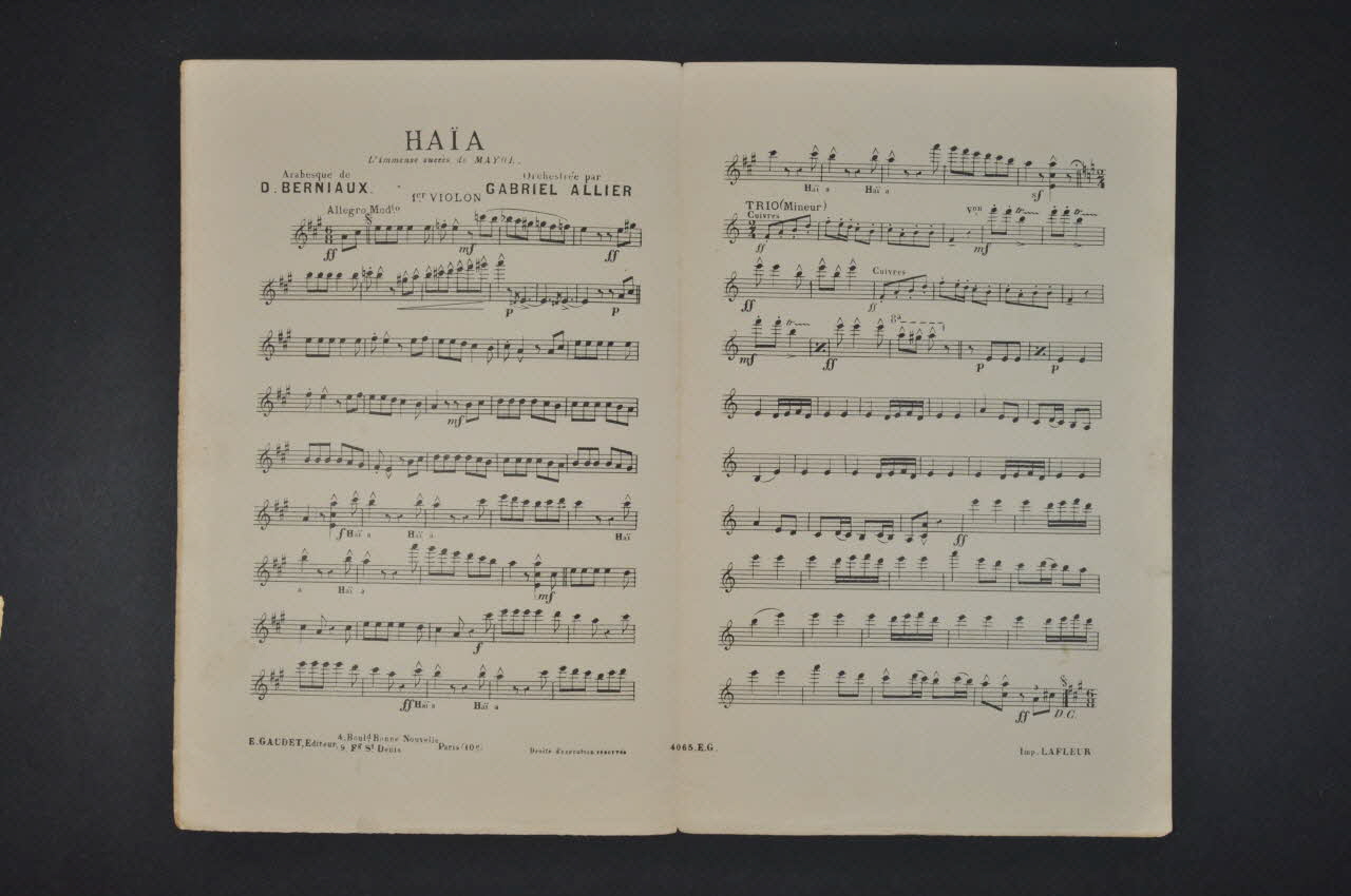 Les inscriptions renseignent le titre de la chanson, le nom des auteurs, de l'artiste et de l'éditeur. A l'intérieur, partitions et paroles de la chanson. Au dos, liste d?autres partitions publiées par l?éditeur.Décor