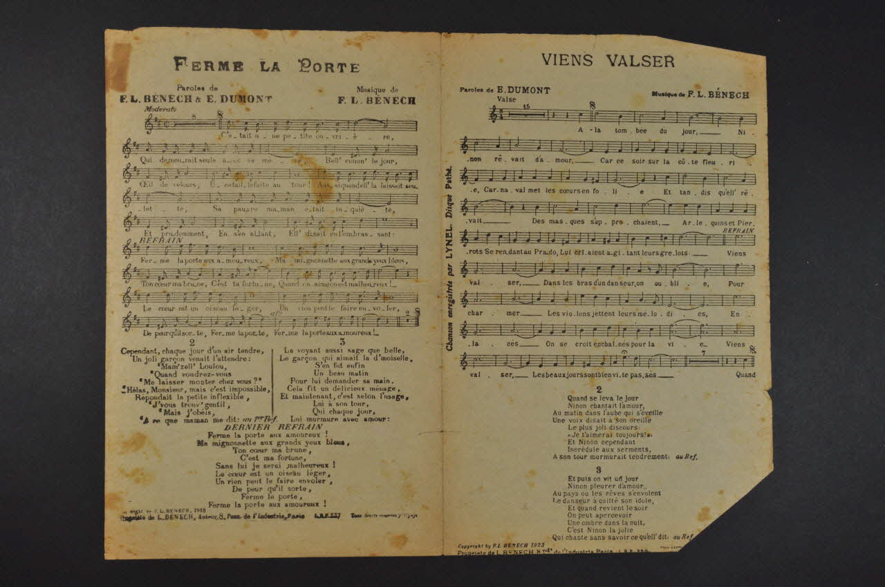 Les inscriptions renseignent le titre de la chanson, le nom des auteurs, de l'artiste et de l'éditeur. A l'intérieur et au dos se trouvent les partitions et paroles des autres chansons.Matériaux et techniques