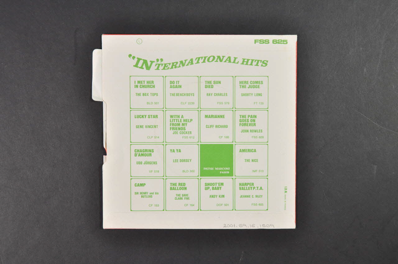 Au recto figurent le nom du groupe et le titre des chansons en vert et blanc sur fond rouge. Le logo de l'éditeur est présent dans le coin supérieur gauche. Un onglet blanc contenant des inscriptions vertes se trouve dans le coin supérieur droit. Le verso comporte diverses inscriptions dans des carrés verts sur fond blanc.Matériaux et techniques