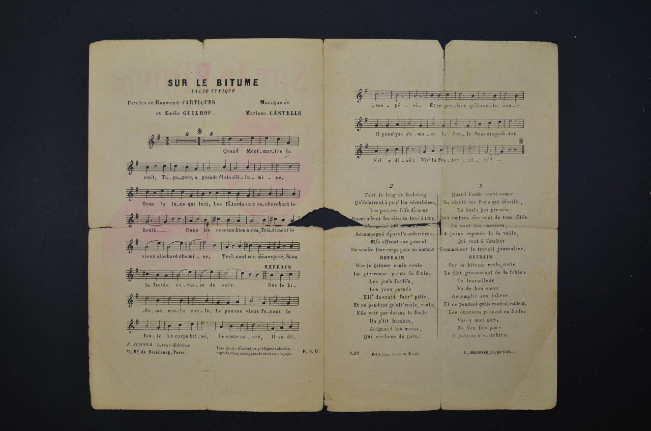 Feuillet rectangulaire en papier industriel imprimé. Le feuillet contient la partition et les paroles de la chanson. Au, dos, publicité pour l'éditeur.Matériaux et techniques