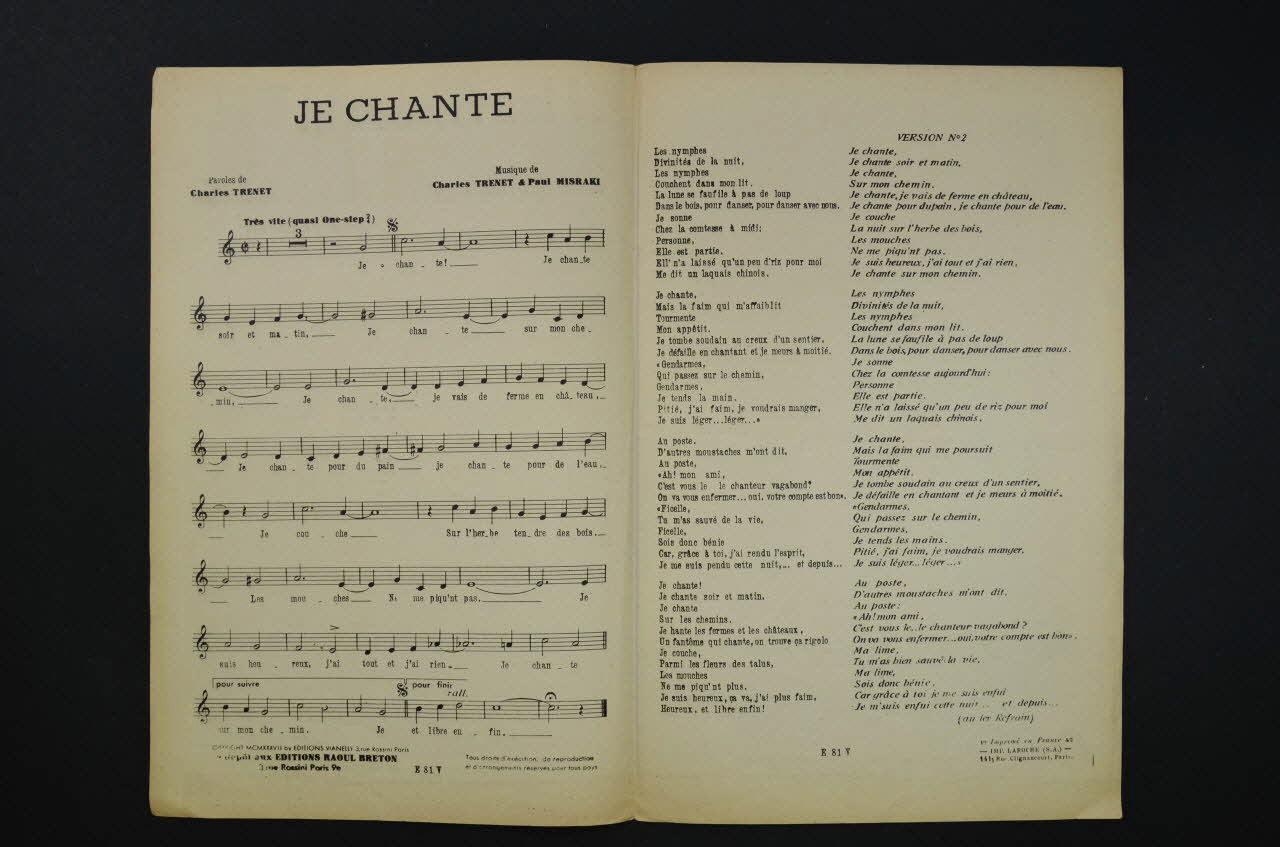 Feuillet rectangulaire en papier industriel imprimé à l'encre bleue (sauf à l'intérieur, encre noire). Sur la couverture, un portrait photographique de C. Trénet sur les toits de Paris.