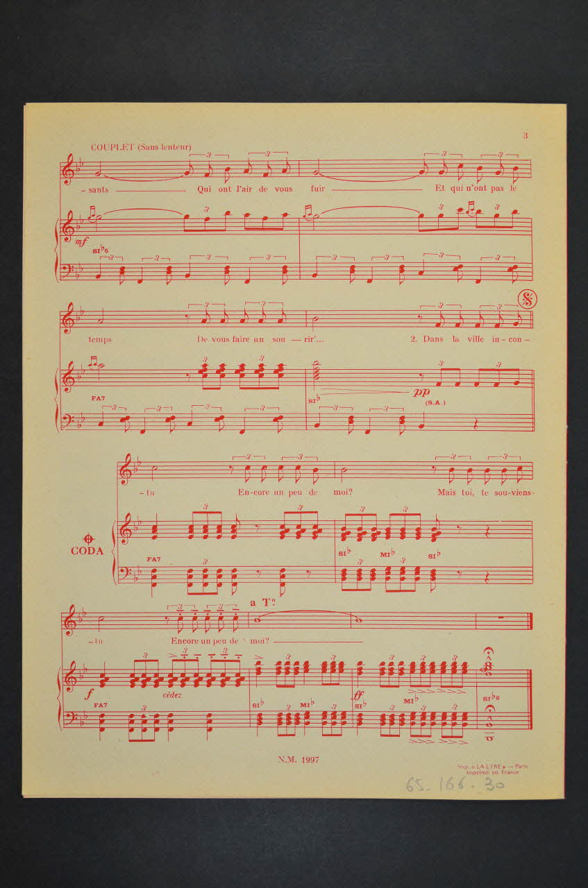 Feuillet rectangulaire en papier industriel imprimé à l'encre rouge et blanche (sauf à l'intérieur, encre noire). Sur la couverture, un portrait photographique de Piaf.