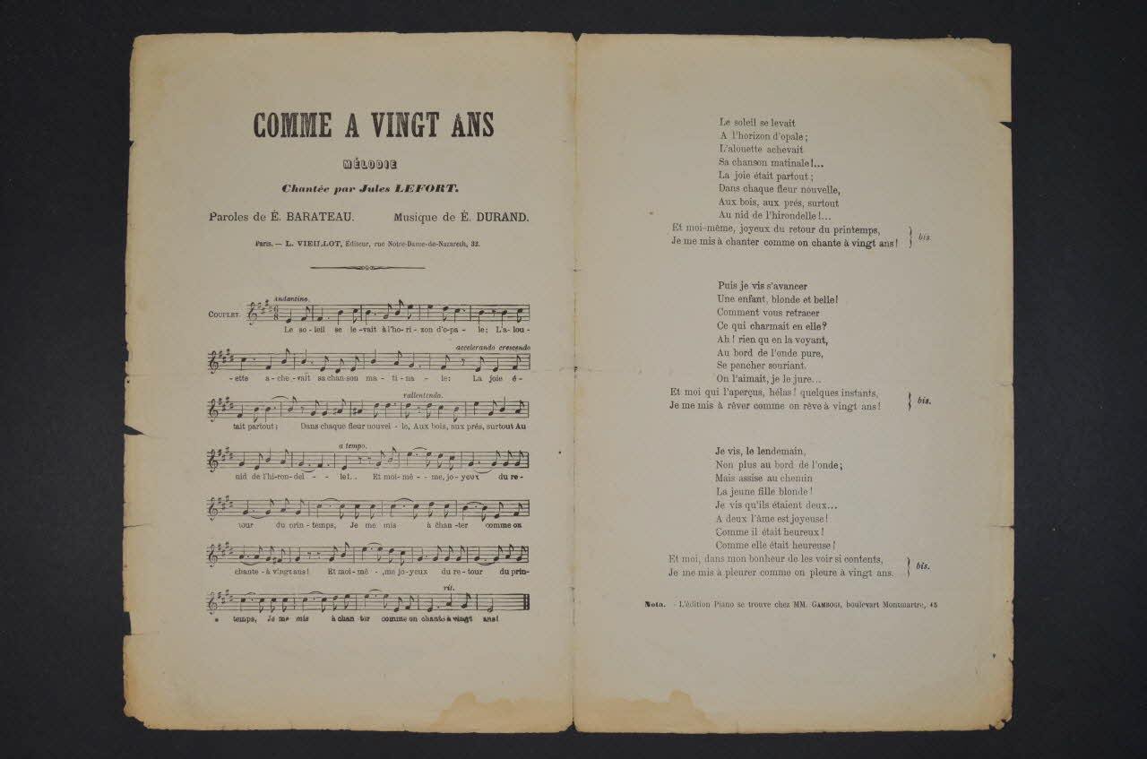 Les inscriptions renseignent le titre de la chanson, le nom des auteurs, de l'artiste et de l'éditeur. A l'intérieur, partitions et paroles de la chanson. Au dos, liste d?autres partitions publiées par l?éditeur.Matériaux et techniques