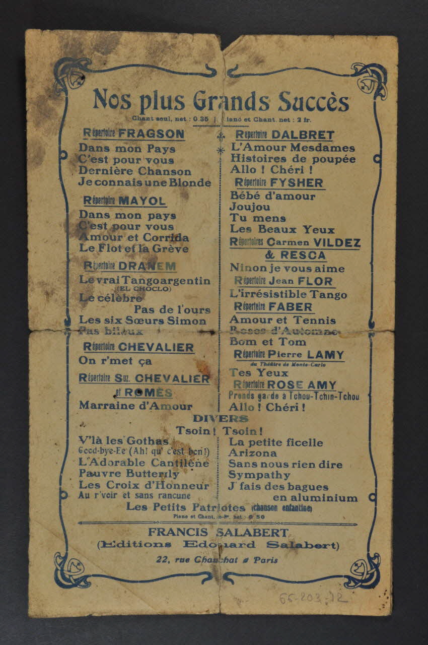 Les inscriptions renseignent le titre de la chanson, le nom des auteurs, de l'artiste et de l'éditeur. A l'intérieur, partitions et paroles de la chanson. Au dos, liste d?autres partitions publiées par l?éditeur.Décor