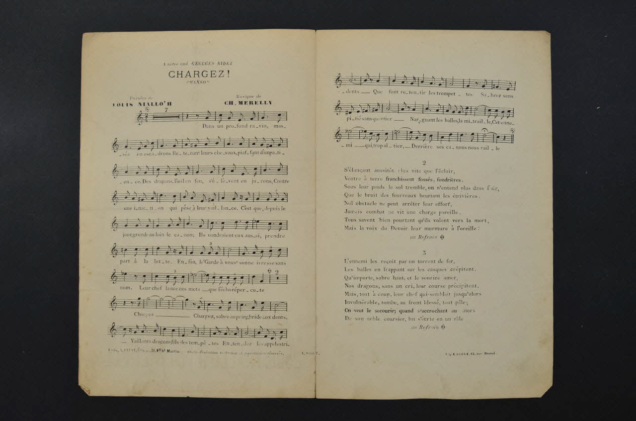 Les inscriptions renseignent le titre de la chanson, le nom des auteurs, de l'artiste et de l'éditeur. A l'intérieur, partition et paroles de la chanson. Le revers est laissé vierge.Décor