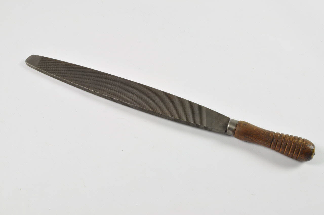 Court manche en bois tourné, gravé de sept rainures, dans lequel est fichée une lame longue, en amande, maintenue par un emmanchement à soie et une virole. Une face de la lame présente des petites dents demi-circulaires, l'autre des stries en diagonale. Un cheval est gravé dans un écusson dans le bas de la lame.Matériaux et techniques