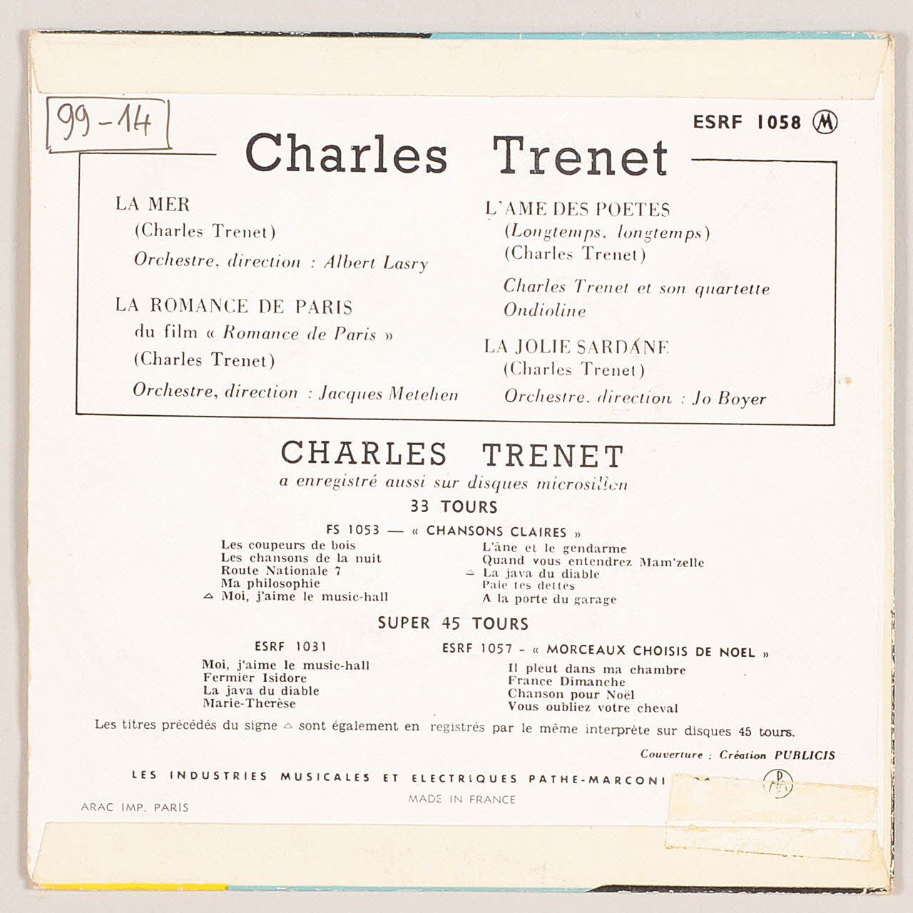 La pochette du disque présente, au recto, une photographie noir et blanc de Charles Trénet saluant en levant son chapeau.