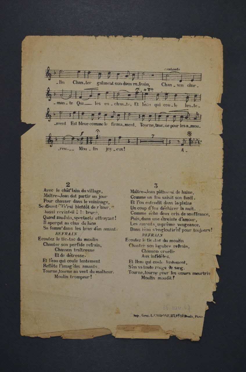 Les inscriptions renseignent le titre de la chanson, le nom des auteurs, de l'artiste et de l'éditeur. A l'intérieur, partitions et paroles de la chanson. Au dos, liste d?autres partitions publiées par l?éditeur.Décor