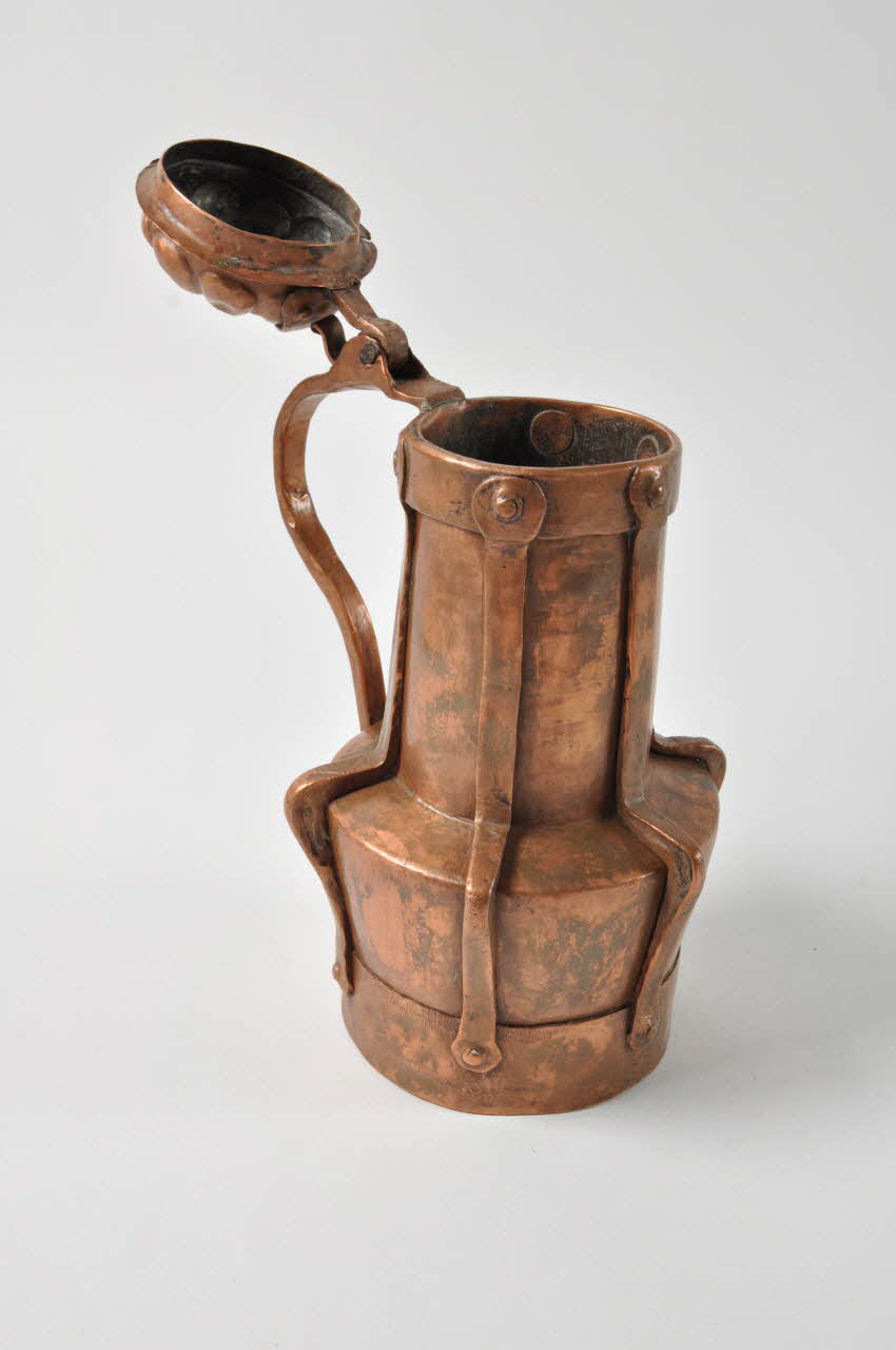 Cuivre rouge battu, à couvercle à charnière, à parties soudées et rivetées / Pichet avec pied creux à corps inférieur évasé et long col droit.