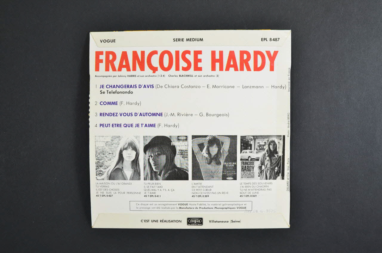 A l'arrière figurent, sur fond blanc, le nom de la chanteuse en rouge en haut, les chansons en violet et noir au centre, puis en partie inférieure des reproductions noir et blanc de quatre pochettes de disque.