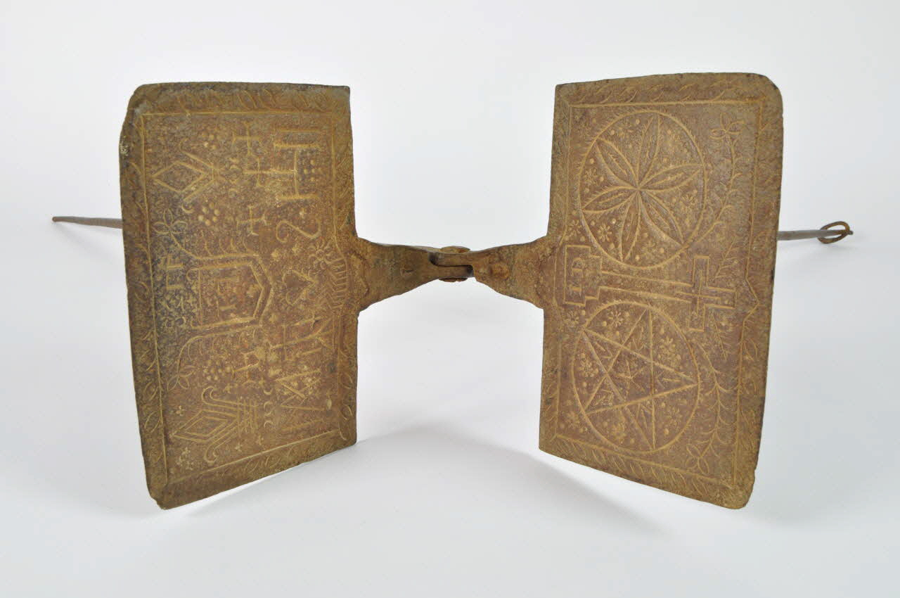 Fer forgé, à décor gravé au ciseau, / Deux branches cylindriques, articulées autour d'un axe, terminées par deux plaques rectangulaires : sur l'une figure un cadre, contenant deux cercles, avec dans l'un un pentagramme et dans l'autre une rosace à six branches, séparés par une croix ornée d'initiales ; sur l'autre est présent un blason présentant des initiales, entouré de deux fleurs de lys, surmontant un coeur et des symboles religieux. Un anneau ovale est fixé à l'extrémité de l'une des branches et se fixe sur la seconde.Inscriptions