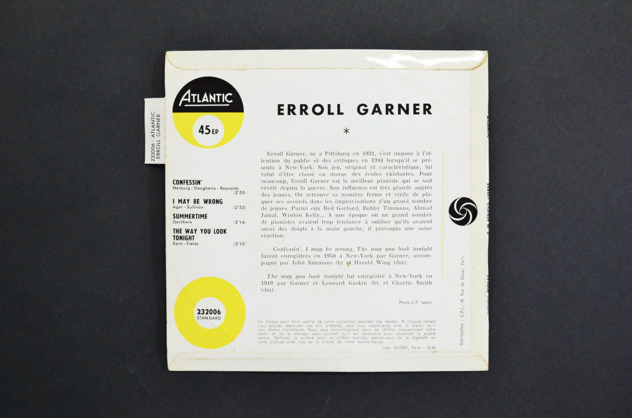 .2 Cette pochette de disque en papier cartonné est de format carré. Le recto comporte la photographie en noir et blanc de l'artiste à son piano et des inscriptions telles que ; le nom de l'interprète et les titres des morceaux. Le verso laisse apparaître le nom de l'artiste et sa biographie, celui des titres, de leurs auteurs et la durée de chacun d'eux. Une languette sur le côté supérieur gauche, indique le nom de l'interprète.