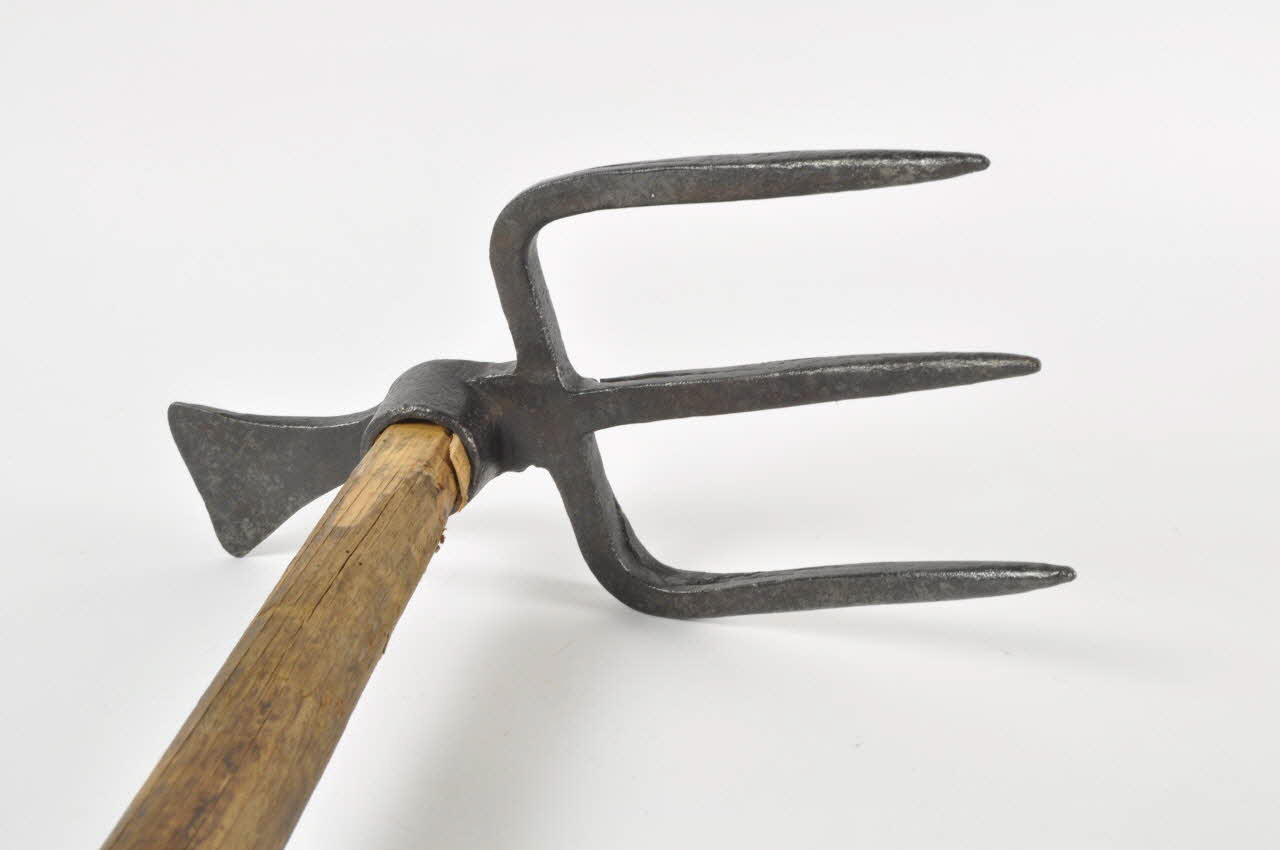 fer forgé et bois / Crochet à trois dents pointues de section rectangulaire, prolongé par une petite lame plate triangulaire. Un emmanchement à oeil circulaire est ménagé au centre, dans lequel est fiché un long manche en bois, maintenu par des coins en bois.Matériaux et techniques