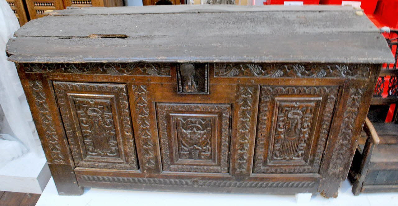 Bois de chêne sculpté en bas relief / Ce coffre à grains en bois de chêne est très ornementé en façade (sculptutre en bas relief). Il dispose d'un couvercle bombé et d'une serrure à moraillon de tradition gothique. Les trois panneaux de façades ont été transformés en portes ouvrantes.