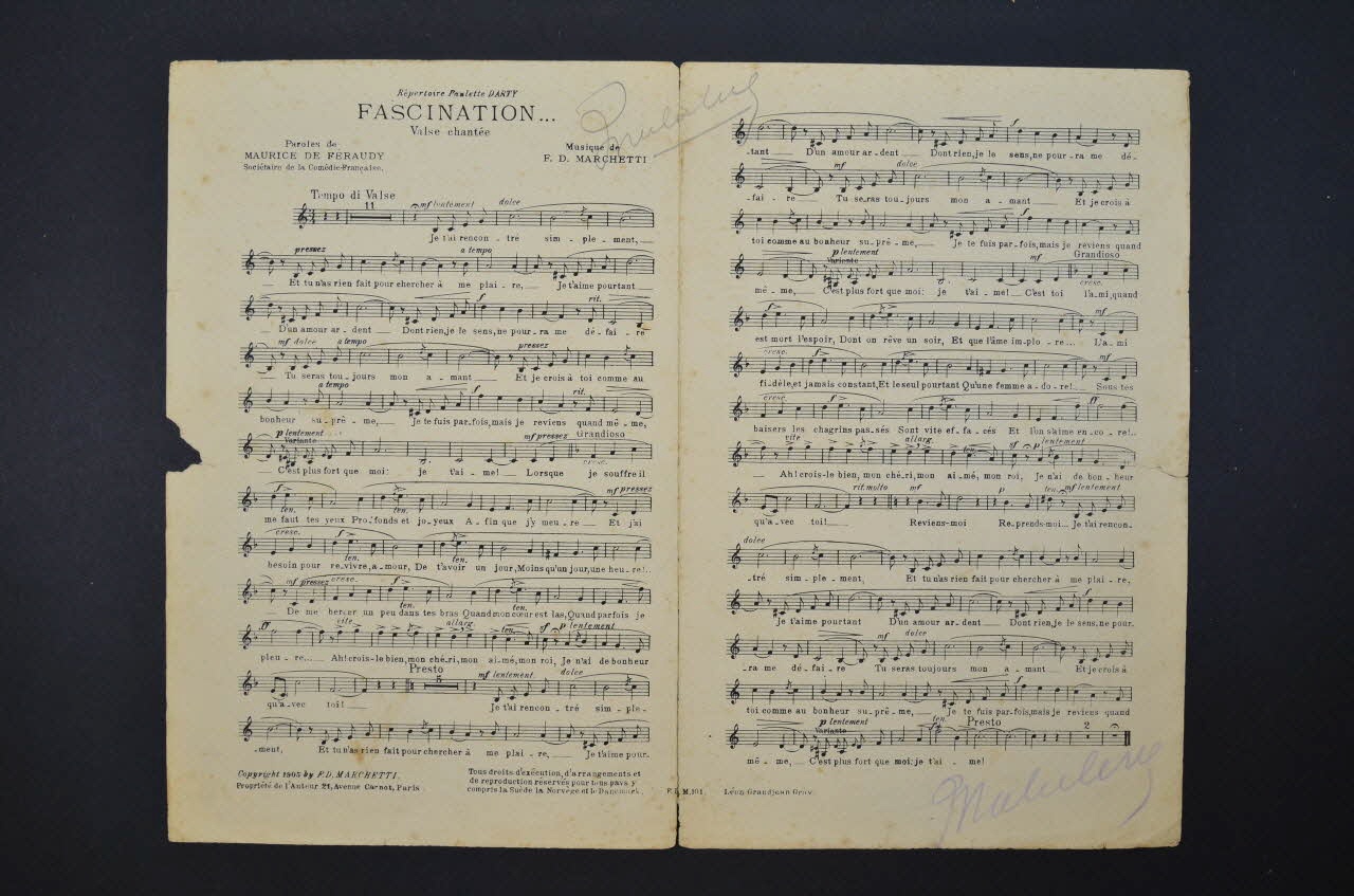 Feuillet rectangulaire en papier industriel imprimé. Le feuillet contient la partition et les paroles de la chanson. Au dos, publicité pour l'éditeur.