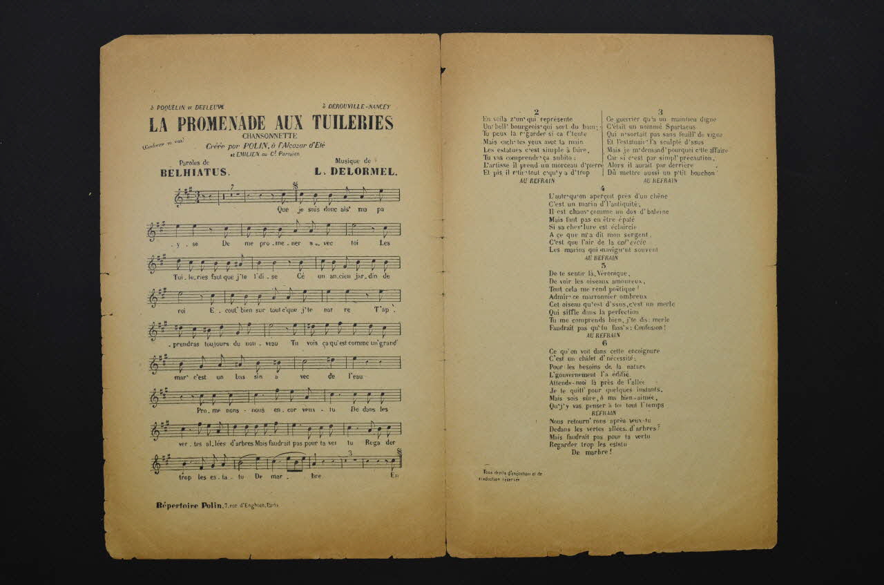 Sur la couverture, représentation d'un soldat et d'une jeune femme dans le Jardin des Tuileries regardant une sculpture en marbre (faune ?). Les inscriptions renseignent le titre de la chanson, le nom des auteurs, de l'artiste et de l'éditeur. A l'intérieur, partition et paroles de la chanson. Au dos, liste d'autres partitions publiées par l'éditeur.Décor
