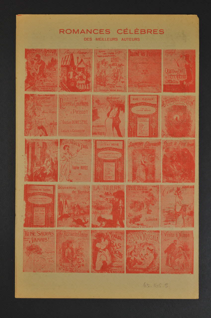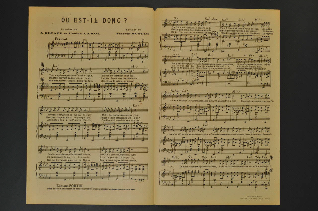 Les inscriptions renseignent le titre de la chanson, le nom des auteurs, de l'artiste et de l'éditeur. A l'intérieur, partitions et paroles de la chanson. Au dos, liste d?autres partitions publiées par l?éditeur.Décor