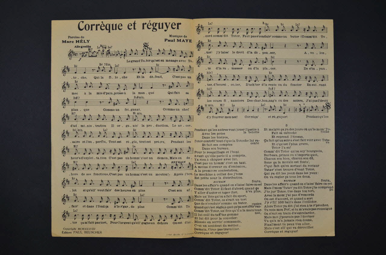 Les inscriptions précisent l'auteur de la chanson, les interprètes et l'éditeur du feuillet. L'intérieur comporte la partition et les paroles. Au dos, une liste d'autres titres disponibles chez le même éditeur.Décor