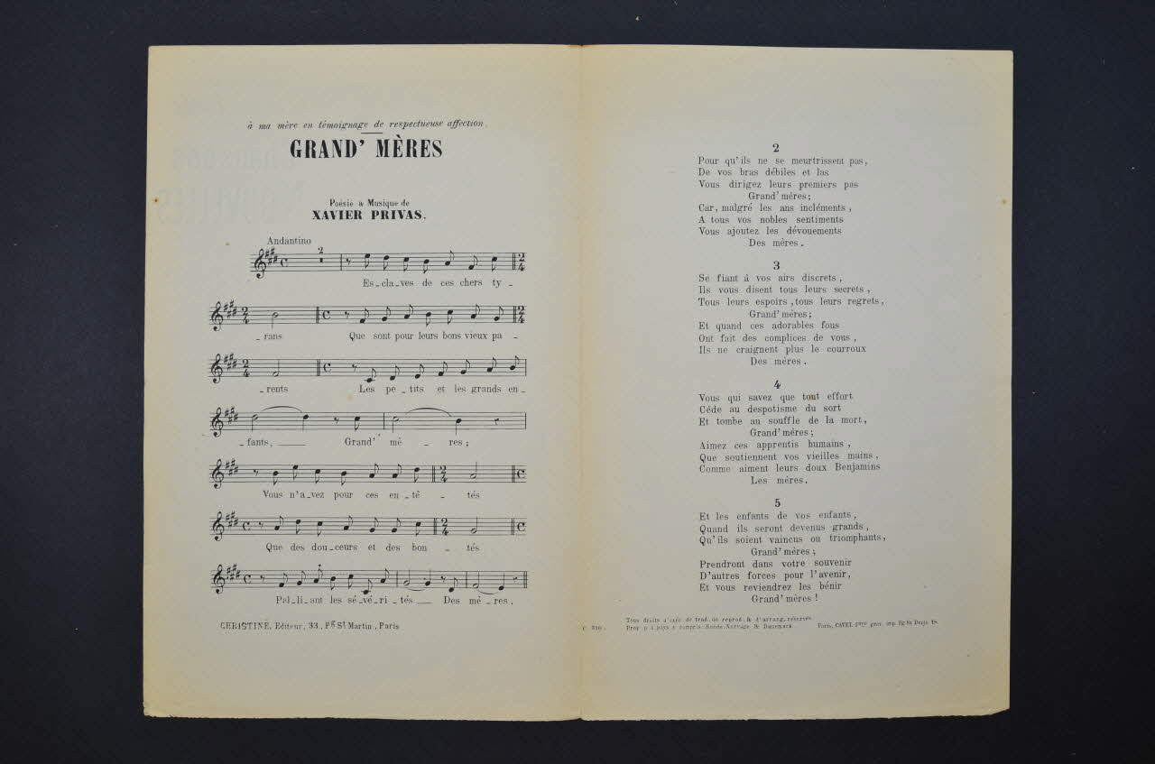 Feuillet rectangulaire en papier industriel imprimé. Le feuillet contient la partition et les paroles de la chanson. Au dos, publicité pour l'éditeur.Décor