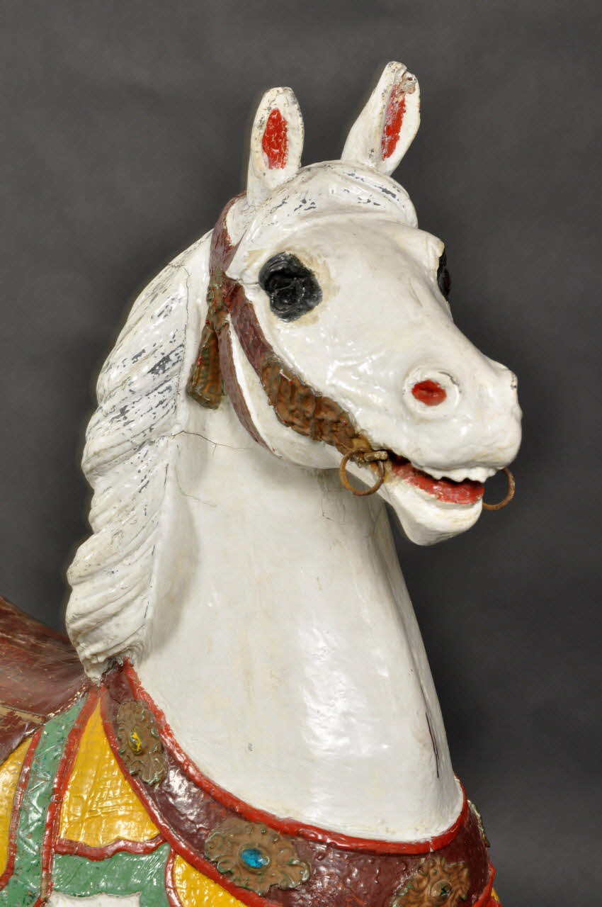 Cheval sauteur en bois peint en blanc appartenant à un manège.