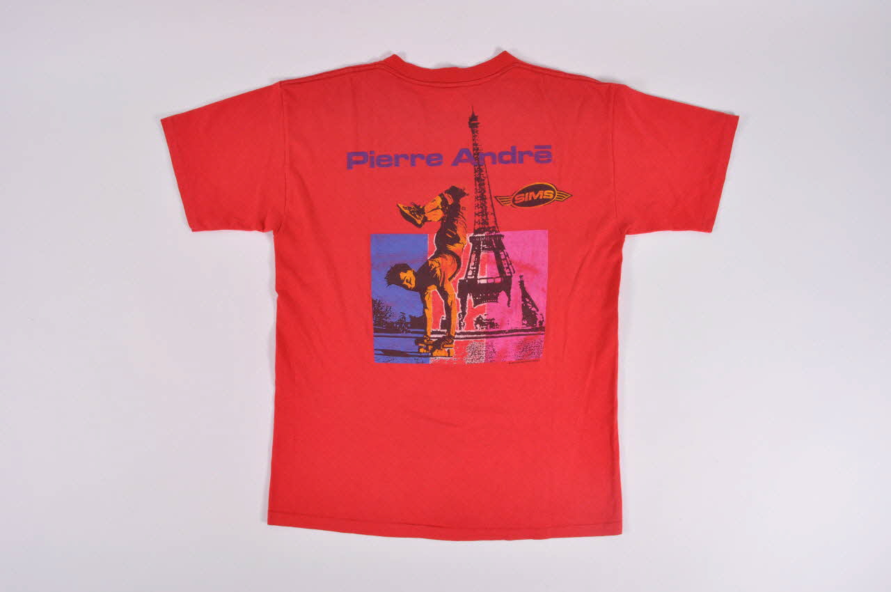 T-shirt en toile de coton rouge, à manches courtes et col rond, orné sur le côté gauche de la poitrine de deux logos imprimés, un personnage très stylisé jaune surmontant un drapeau bleu blanc rouge, et un ovale jaune à fond bleu flanqué de deux ailes. Dans le dos est imprimé un large dessin : sur fond bleu blanc rouge est représentée la silhouette de la Tour Eiffel, devant laquelle évolue un skateur, debout sur les mains sur une planche.Décor