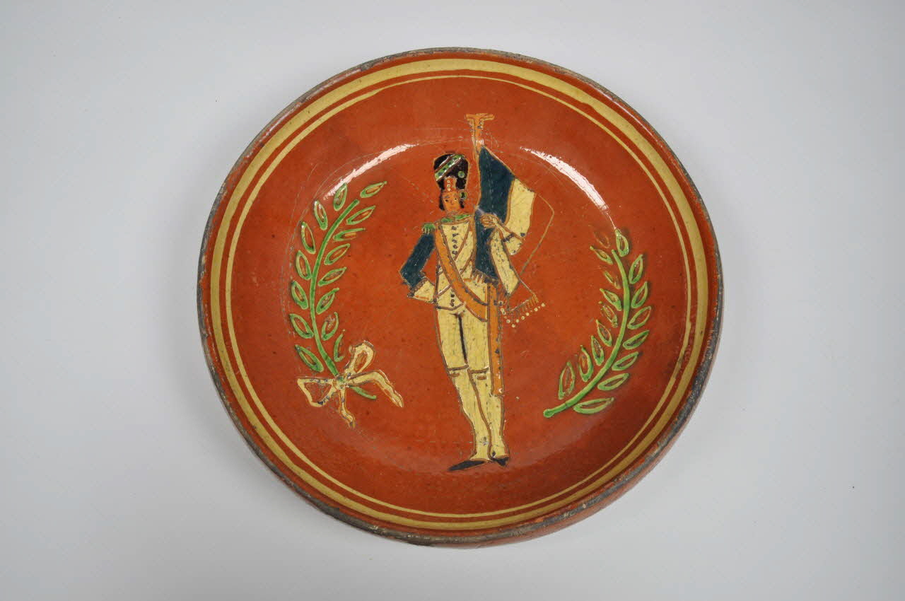 Terre vernissée, décor peint et gravé engobé / Plat rond à bord évasé formant rebord droit à l'extérieur. Motif incisé et peint d'un grenadier debout tenant drapeau tricolore entre deux palmes vertes sur fond marron. Sur le bord deux filets jaunes. Pied plat circulaire. Deux paires de trous de fixation sur le pied.Décor