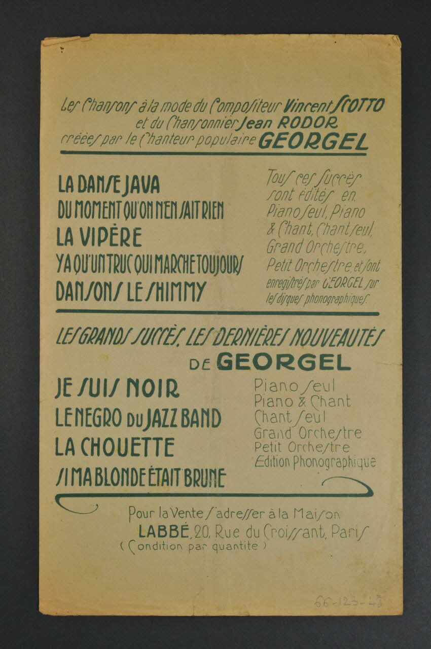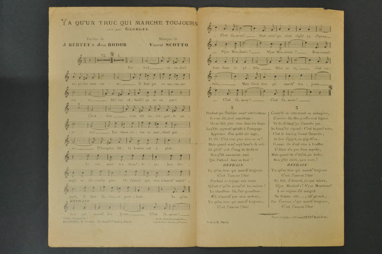 Les inscriptions renseignent le titre de la chanson, le nom des auteurs, de l'artiste et de l'éditeur. A l'intérieur, partitions et paroles de la chanson. Au dos, liste d?autres partitions publiées par l?éditeur.Décor