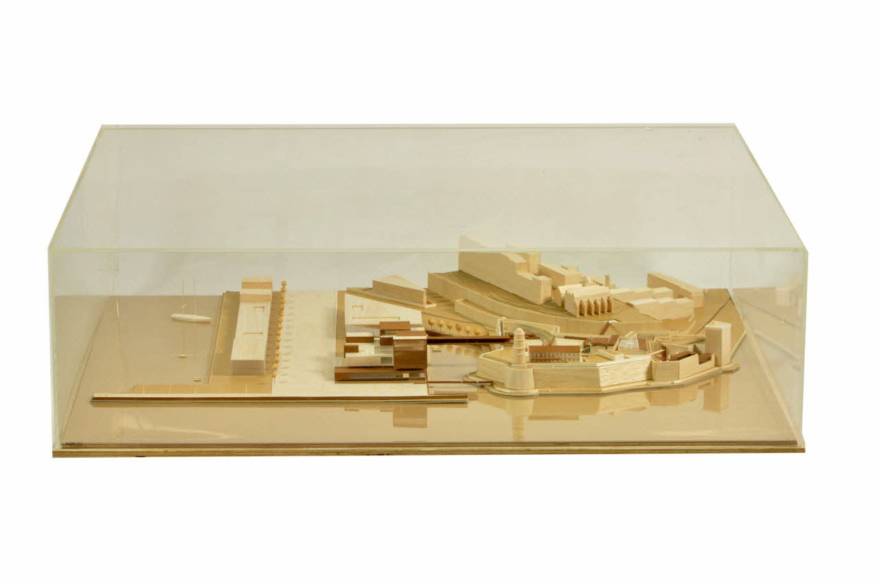 Elle est constituée d'une base en bois de deux planches de bois rectangulaires superposées, la planche inférieure étant plus grande. Sur cette base, une plaque de carton et une plaque de plexiglas représentant la mer sont fixées. Sur le plexiglas, trois couches de carton constituent la terre. Elles sont couvertes d'autres couches selon les niveaux. Les bâtiments et le sol sont représentés en balsa, en plexiglas et en plastique mat. Les arbres sont des boules de bois plantées sur des tiges de métal. Plusieurs zones sont discernables sur la maquette. Tout d'abord la zone maritime au Sud, puis la zone du môle J4 à l'Ouest, le Fort Saint-Jean vers l'Est, et enfin le quartier du Panier au Nord. A l'Ouest de la zone du môle J4, une rade reçevant un grand bateau et deux petits. Le long de cette rade un très long bâtiment rectangulaire. Son toit en balsa présente plusieurs ressauts et ses façades sont en plastique mat. Le long de la façade Est de ce bâtiment, une rangée d'arbre, puis l'esplanade. Le bâtiment du môle J4 est de plan rectangulaire et constitué de de balsa de deux couleurs. Il est composé de nombreux volumes géométriques imbriqués créant des variations de niveaux importantes. Certaines façades sont pleines et les autres sont en plastique mat. L'une d'elle, donnant sur la mer, est caractérisée par des persiennes. Au centre d'un des niveaux, une ouverture en plexiglas transparent permet de voir les niveaux intérieurs et les communications entre eux. La passerelle reliant l'un des niveaux aux remparts supérieurs Ouest du Fort Saint-Jean est fermée du côté Nord et ouverte vers la mer. Une seconde passerelle relie légèrement au dessus du niveau de la mer l'esplanade située entre le bâtiment du môle J4 et la mer et la partie basse des remparts Ouest. A l'arrière de ce bâtiment, un autre, sur plan trapézoïdal irrégulier, présente des façades en plastique mat. Il est relié avec le précédent par un toit en plastique transparent qui crée comme une cour couverte. Sur le Fort Saint-Jean sont visibles de nombreux bâtiments. Certains ne sont pas modifiés dans le projet du musée, comme la Tour du Fanal à l'Ouest, tour circulaire à trois niveaux et dôme sommital, et la Tour du Roie René à l'Est, tour de section carrée. Les modifications sur les bâtiments déjà existants et les nouvelles constructions sont figurées par du balsa plus sombre. Le toit du bâtiment Georges-Henri Rivière en fait partie, ainsi qu'une terrasse partant de son premier étage et donnant sur la mer. Les dénivelés de la partie Nord du Fort sont nivelés par des escaliers et des murs. Les bâtiments les plus à l'Est de la partie haute du fort voient leurs toit surélevés par des baies en plexiglas. Dans la cour de la partie basse du Fort sont visibles des passerelles et rampes reliant les niveaux, un ascenseur en plexiglas transparent et deux bâtiments en balsa sombre et plexiglas transparent du côté de la mer. Une passerelle relie le rempart Nord du Fort et le quartier du Panier, passant au dessus du bâtiment carré du Mémorial des camps de la mort. La dernière partie discernable sur la maquette est celle du quartier du Panier, au Nord. Il est surélevé par rapport à la route qui le sépare du Fort et de la mer et les couches de carton figurent les courbes de niveau. Il est constitué de grandes barres d'immeubles géométriques. En surplomb de la route (sur laquelle figurent un bus et deux voitures), deux bâtiments plus anciens : ce qui semble être un église et un autre bâtiment présentant un dôme. Dispersés sur les espaces du musée, de petits personnages en bois très fin, figurent le public. Un des bâtiments s'est détaché. Il se situé dans le coin Nord Est. Il présente un plan complexe avec une façade à deux ressauts. Il est situé dans un sachet à part et est numéroté 2017.42.7.1-2. La maquette est couverte d'une cloche en plexiglas amovible, de section rectangulaire.Matériaux et techniques