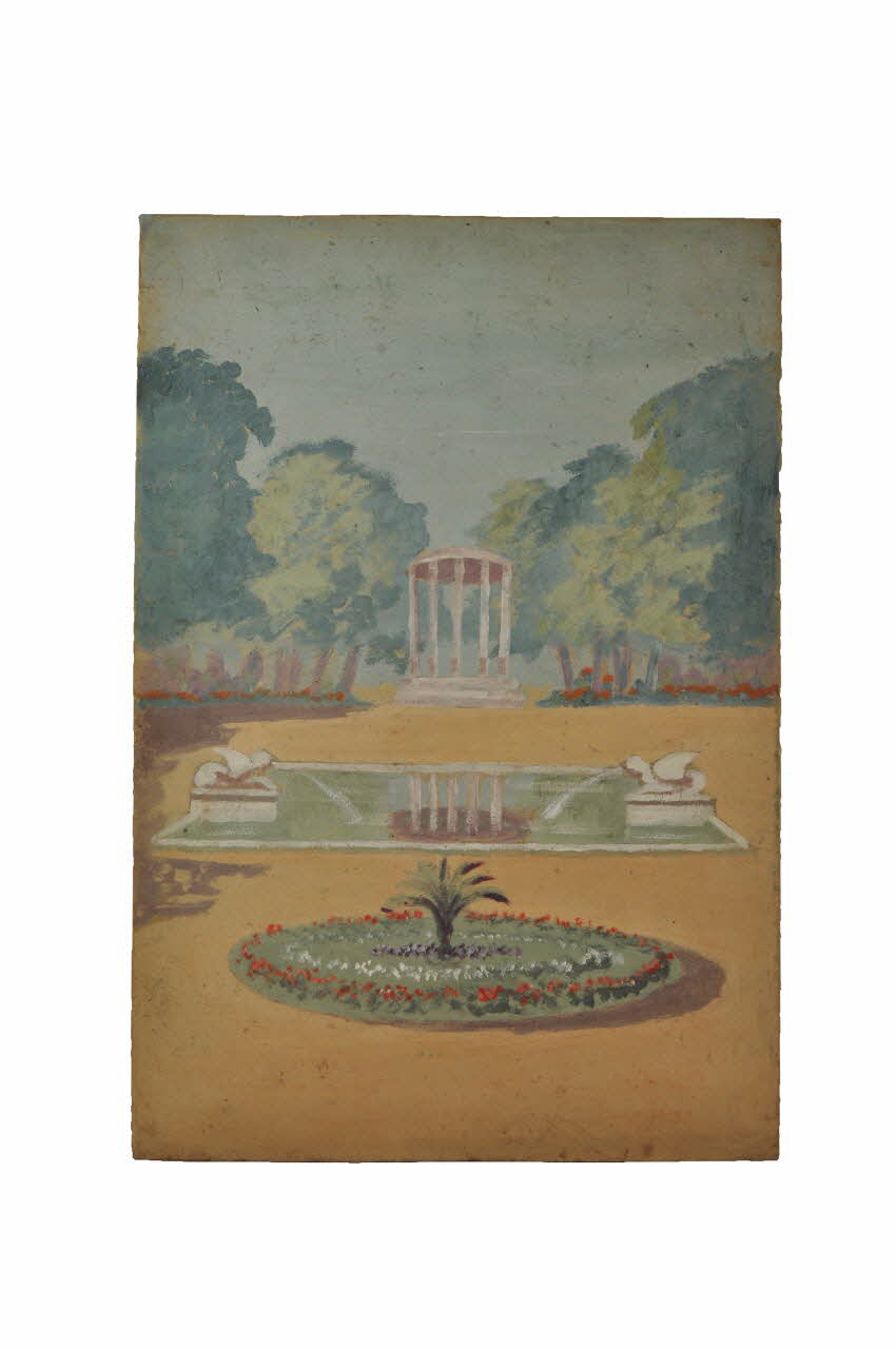 L'arrière plan est fermé par une rangée d'arbres avec un kiosque blanc au centre.