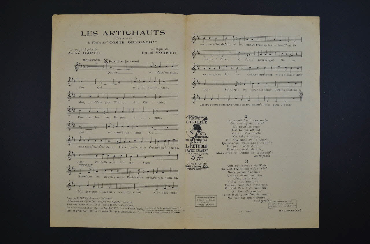 Des inscriptions renseignent le titre, les auteurs, les exécutants et l'éditeur. A l'intérieur, partition et paroles de la chanson. Au dos, liste d'autres partitions publiées par l'éditeurDécor